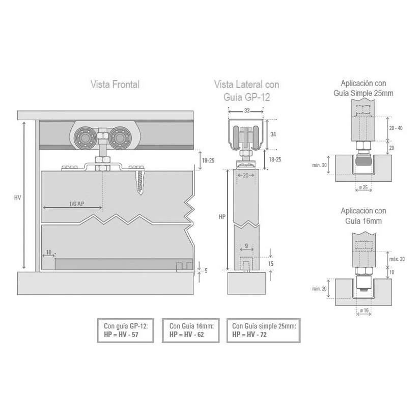 Sistema corredizo colgante con rodamientos de acero templado, para portones dentro de vano de hasta 100 Kg.