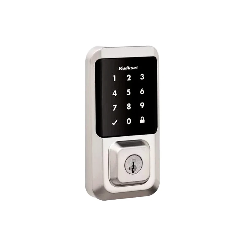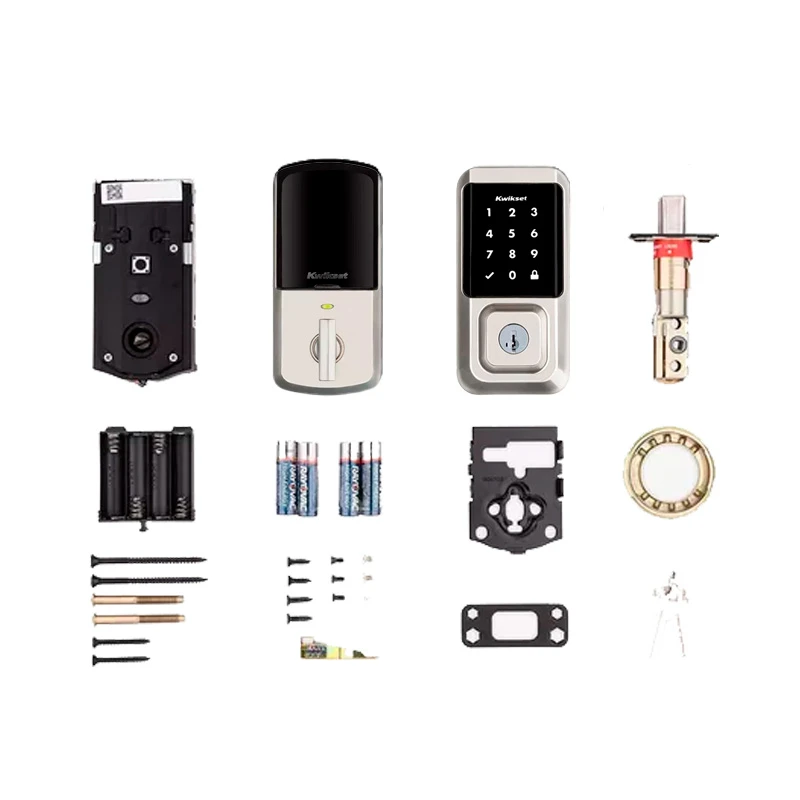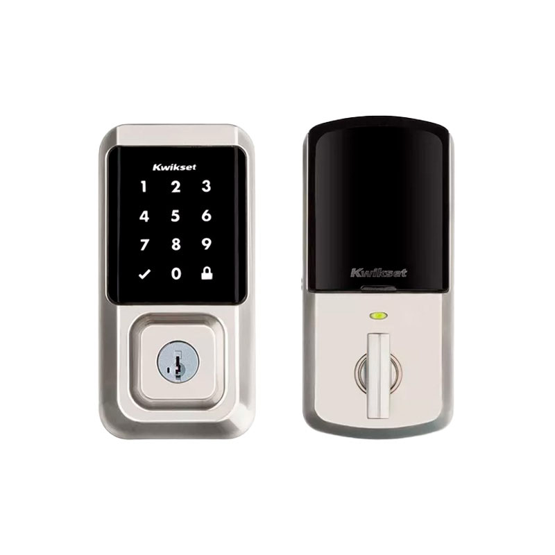 - Pantalla segura: Función de seguridad patentada para cerrojos de pantalla táctil Kwikset que evita la identificación de código de usuario de huellas dactilares en pantalla mediante el empleo de dígitos aleatorios antes de introducir un código de usuario personal. Asistente de voz: Funciona con Alexa y Google Assistant.