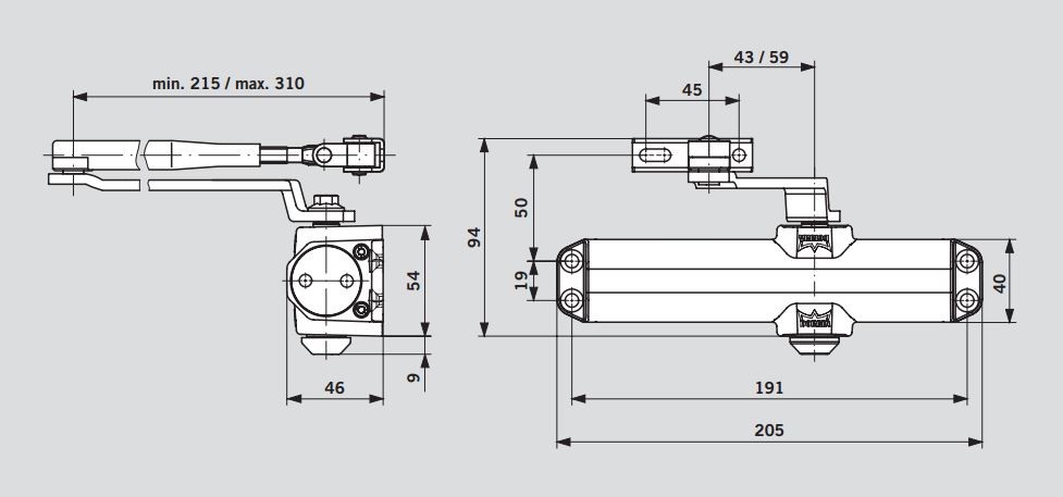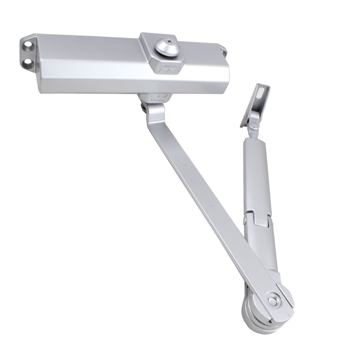 Es particularmente rápido y fácil de instalar y no requiere placa de montaje. Se puede seleccionar fácilmente la fuerza del cierrapuertas en función del tamaño de la puerta cambiando la posición de apoyo del brazo o desplazando el cuerpo del cierrapuertas.