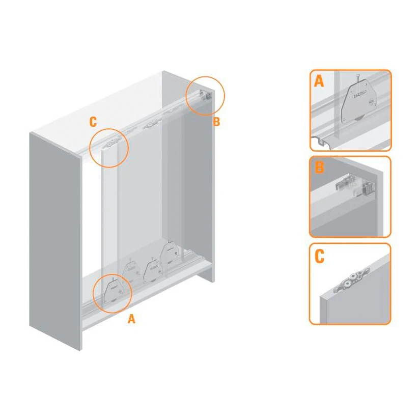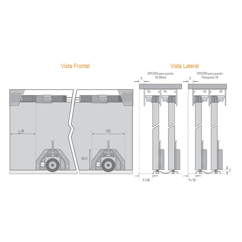 - Corredera al piso para puertas de clóset de 50 Kg. de instalación sobrepuesta.